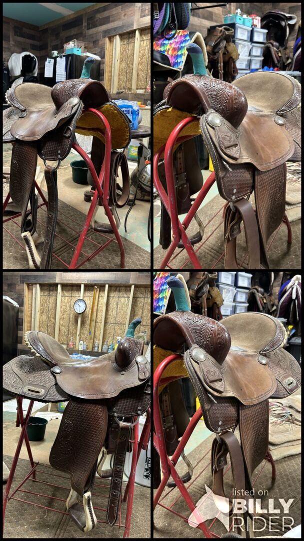 16inch double T, barrel saddle, Good flocking, would fit better for a wide horse, 8inch gullet. Rawhide is unwrapping on the horn (hence the vet wrap.)