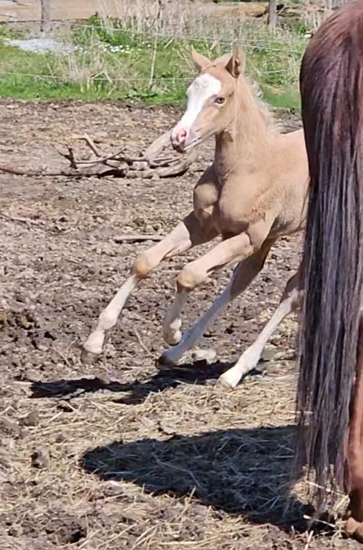 Absolute eye-catcher (Quarter Horse) - Location: 83128 Halfing Wanda - a dream on 4 legs. Quarter Horse filly, born 3.25 with an estimated final height of 152 cm, enchants everyone with her look and her appearance. She has the wonderful color palomino with interesting markings on her head. Wanda is a very good foal, with a correct, strong build and great movements. The foal is still a little reserved, but is slowly thawing out and becoming more curious. She is always friendly and well-behaved. Later she wants to become an athlete and shows this through her lively behavior. The foal is handled daily, knows the farrier and vet and the foal ABC when she is handed over. Later she will certainly be a good partner in the reining classes, but due to her good movements she is also interesting for ranch riding, ranch rail etc.. Wanda`s pedigree makes every reining fan`s heart beat faster: Spooks Gotta Gun, Shining Spark, Peponita, Topsail Flashy Jac. Her sire is the successfully shown Spooks Grand Slam (LTE: 150,000 $). She can stay for breeding if desired.