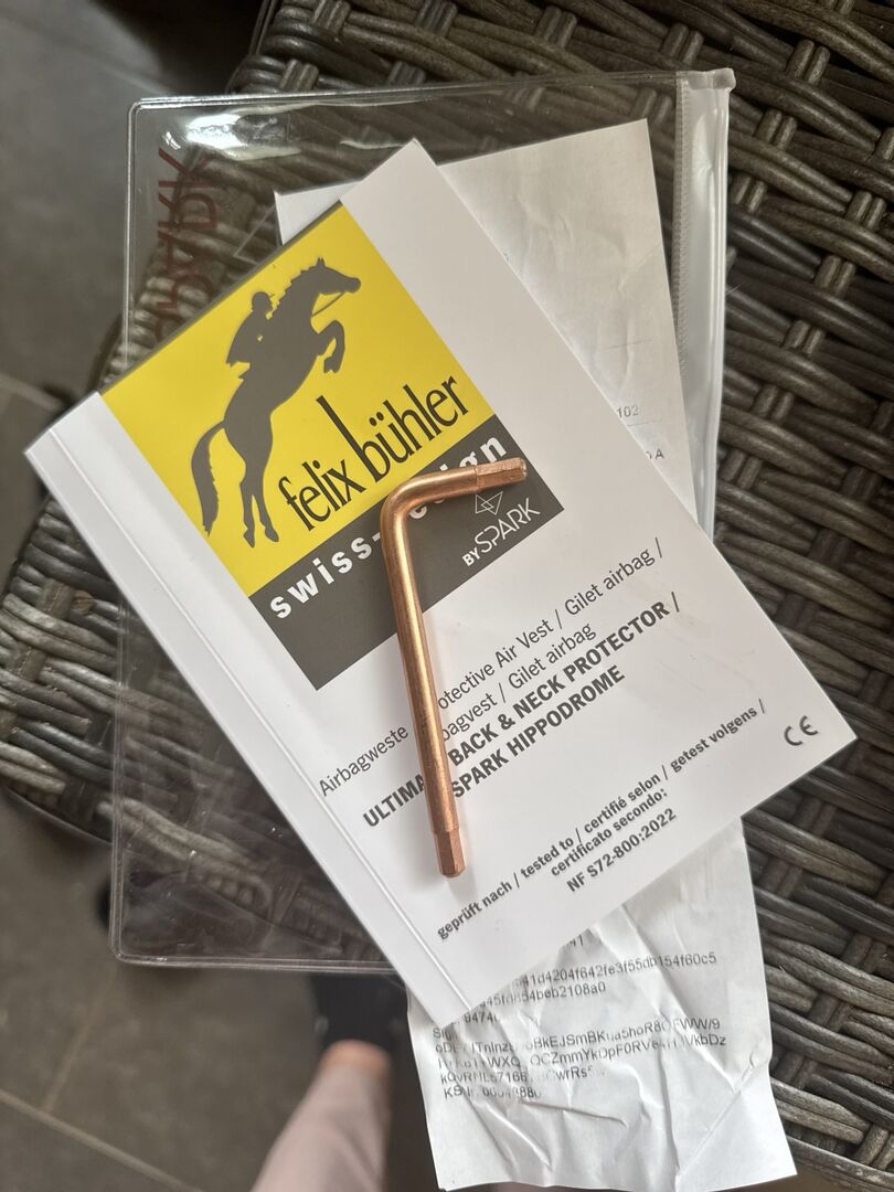 ARTICLE DESCRIPTION Airbag vest for riders with large neck airbag. Protects the upper body and neck in the event of a fall from a horse. In cooperation with SPARK, specialist for airbag vests for riders, Felix Bühler has developed this airbag vest, which sets new standards in terms of safety and is certified according to the airbag vest standard NF S72-800:2022. Within 0.2 seconds of the airbag being activated, the air tubes are filled and protect the rider's back, hips, chest and neck. The extremely large airbag in the neck area offers maximum protection in this area and can protect against serious injuries. Additional shock-absorbing foam is incorporated at the front to further increase the protective function. The airbag is activated by the operating strap, which is attached to the stirrup lock. Thanks to the one-click connector, the airbag vest can be quickly attached with the operating strap or detached from the saddle before dismounting. The waist belt allows adjustment to the individual waist size. After activating the airbag, simply replace the CO2 cartridge, close the Velcro fastener on the neck airbag and the press stud on the hip and the vest is ready for use again. Upper material made of tear-resistant nylon. The scope of delivery includes the elastic strap incl. operating strap for attachment to the saddle and an Allen key.