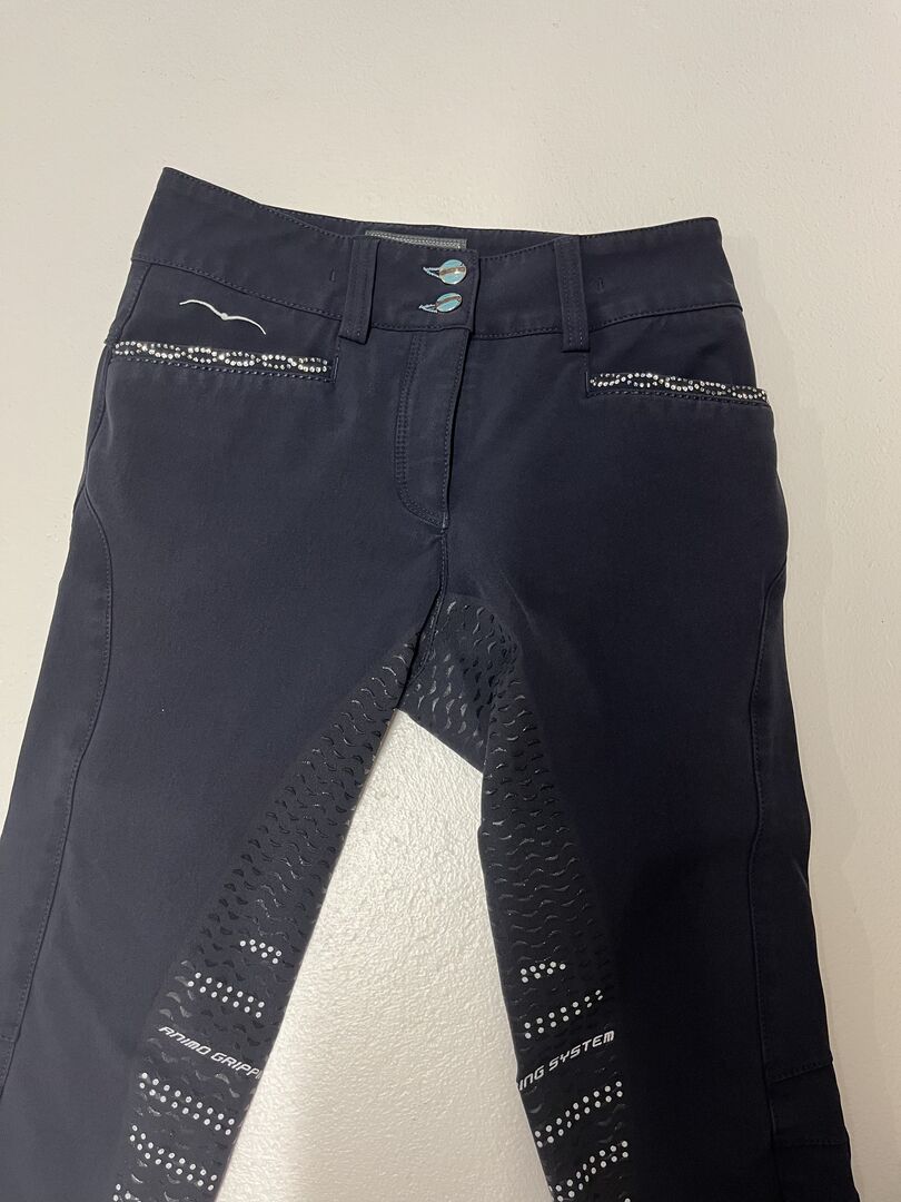 Animo Ladies Fullgrip Breeches High-Waisted dark blue - I sell this Animo ladies breeches high-waist in dark blue with full grip. She is still in really good condition! Size 32 The Fullgrip is still completely intact as well as all rhinestones on the front and back pockets!