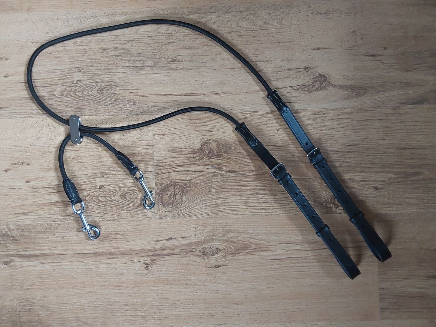 Auxiliary reins, reins with pulleys, new - New and unused - For work on the lunge or under the saddle. Carabiners and pulleys nickel-plated. The effect is similar to that of adjustable elastic binders, but with the advantage that, thanks to the pulleys, there is no tension on the outside of the horse's mouth when bending. Stainless steel buckles.
