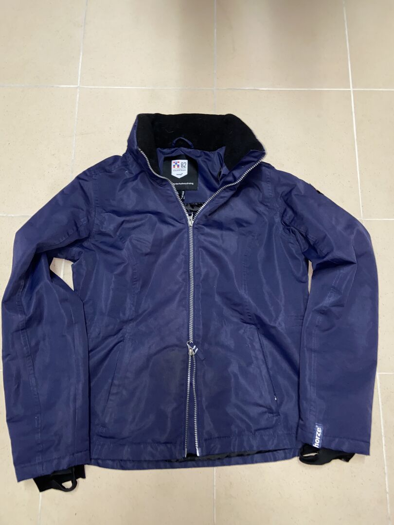Blue winter / transitional riding jacket size 36 - Waisted cut, adjustable in the waist, side zippers for comfortable riding. With thumb hole and removable hood from the collar. Water repellent.