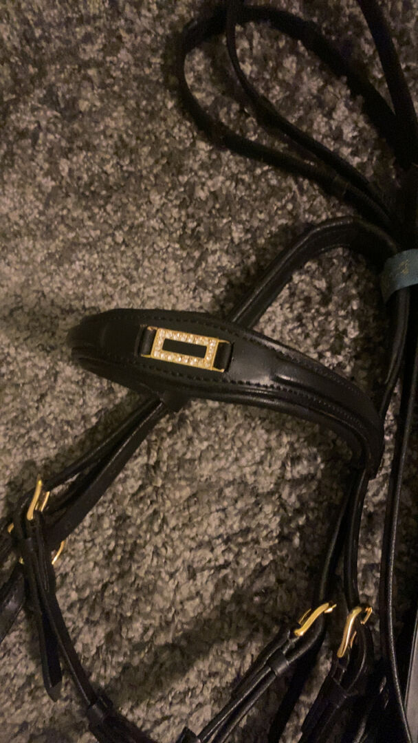 Bridle gold including reins - For sale a new bridle from USG. The bridle has gold buckles and a gold browband. Reins are included.
