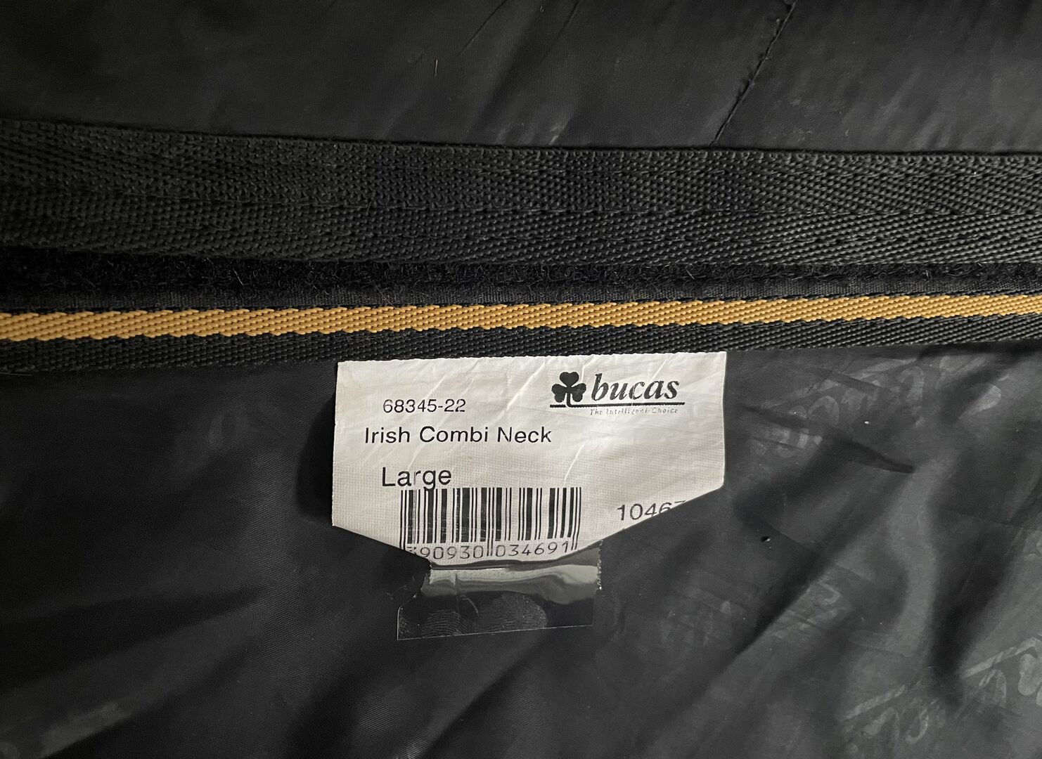 Bucas outdoor blanket Turnout light 50g, size 155, black with neck - Sell a very rarely used, almost as new (see photos) bucas outdoor blanket Irish Turnout light incl. neck part. It has the size 155 cm, the neck part size L in the color black / gold. The rather narrow fit unfortunately does not fit my somewhat robust horse. The blanket is washed to maintain the function with Nikwax Rug Proof and subsequently sprayed with Nikwax Tx.Direct Spray-On, it was washed the first time.