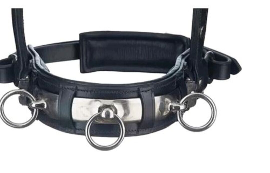 Cavesson with three-piece cavesson iron, which prevents scissor or clamp action, and three rings. With soft padded noseband, chin pad and headpiece. Can be used with or without a bit. Size adjustable from small horse to warmblood