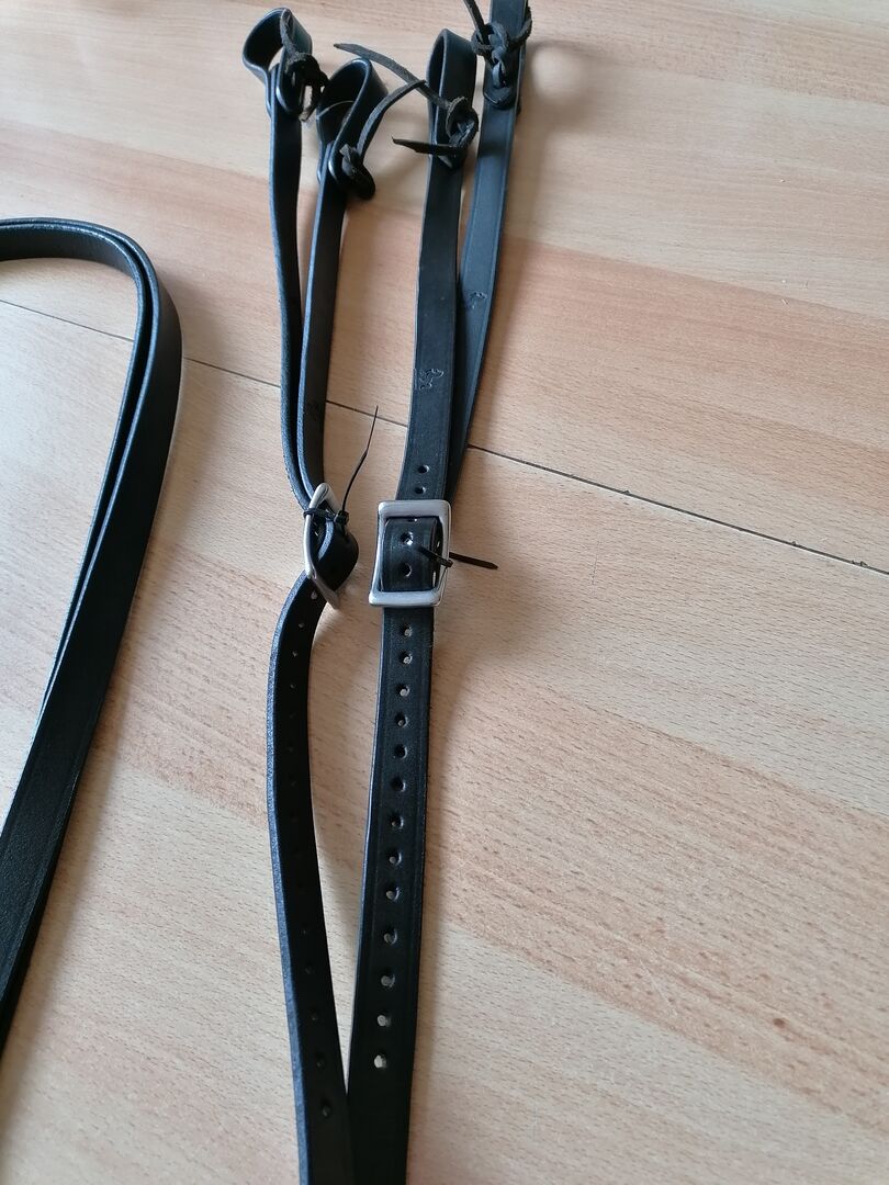 Special reins, tandem reins, double reins for pelham, curb etc. For conversion to bit, bit with suits, bitless + muzzle piece etc. Somewhat unusual reins for both classic and western style. Brand; Grosskorth, reins are not closed, "Split Reins". New and unused made of sturdy, oiled black quality leather ****** Excellent for combined riding *******