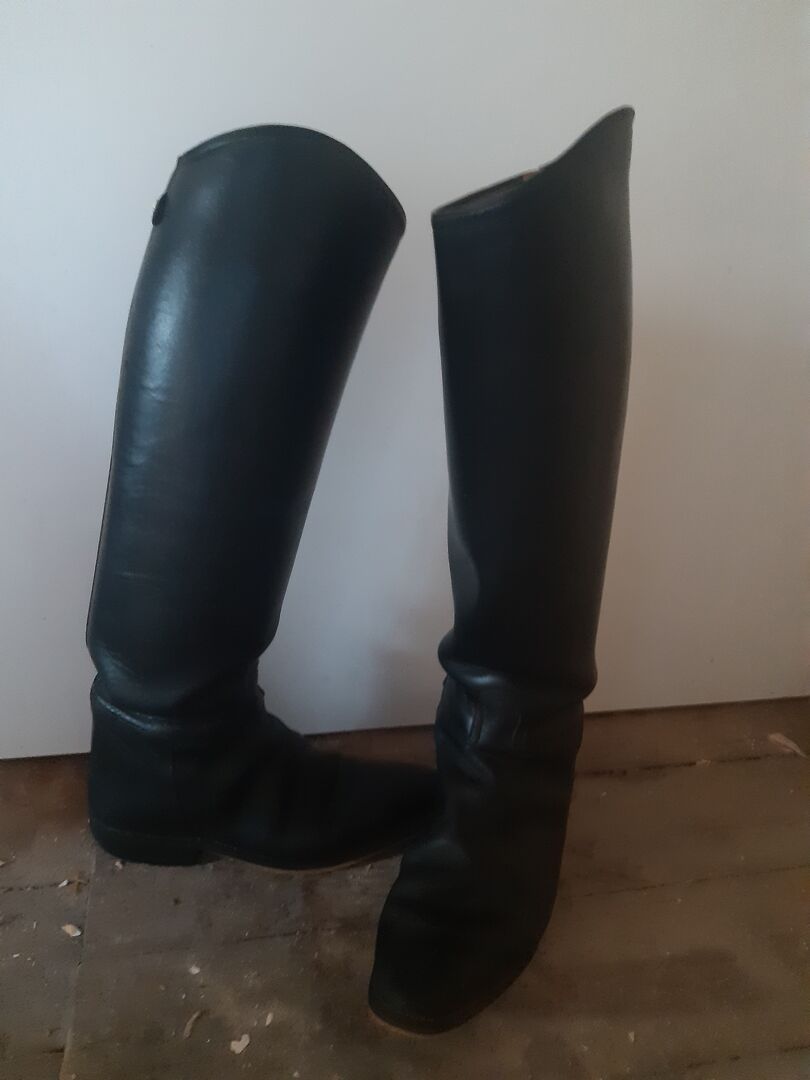 These dressage boots not only still look immaculate, with decorative stripes in brown on the sole, but are also extremely sturdy and durable. I myself inherited these boots 6 years ago and before that they were also worn for several years. The only drawback is a small scuff on the shoe top of one boot, but this is not noticeable in use.