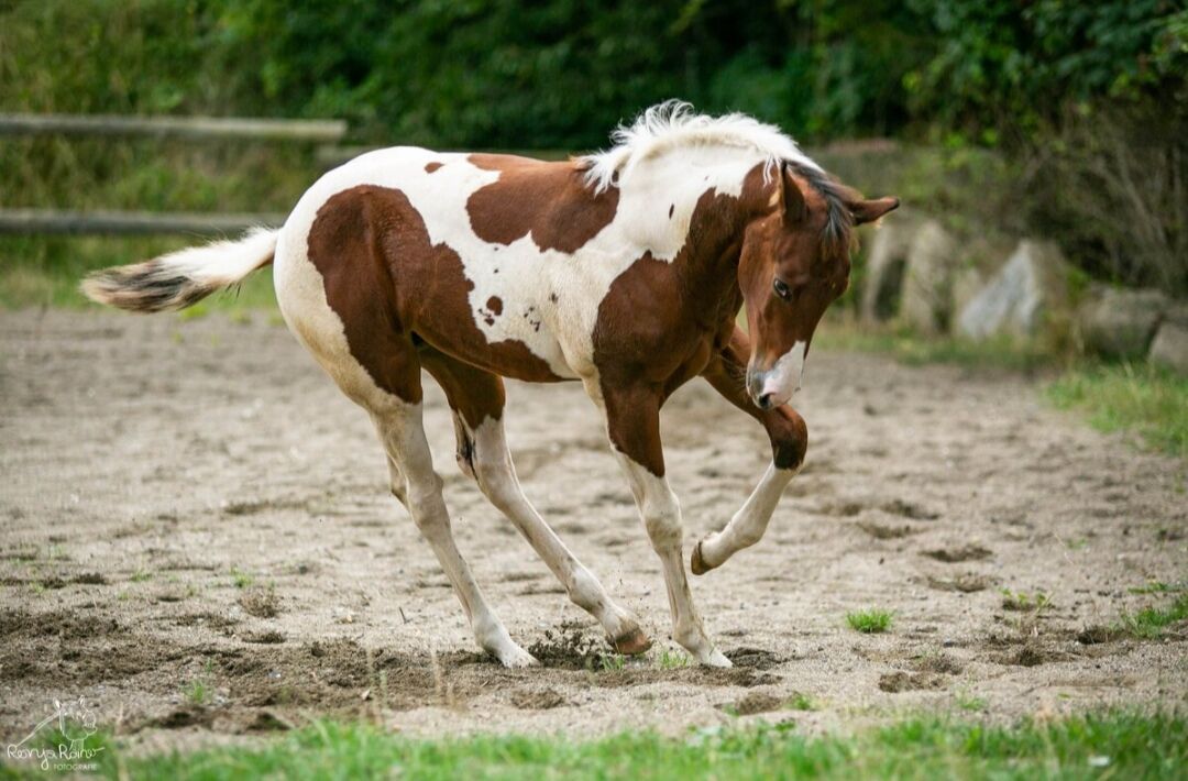 Fantastic cool Paint Horse mare APHA 2024 - Hi, I am little Chaska (Indian = firstborn) and I am a Bay Tobiano filly. I was born in April 2024 and am now looking for a loving owner. My dad is Deltagun Peppy MR, a 150 cm tall Paint stallion with the very best pedigree and 100% check inheritance. My mom is FS Olenas Blue Chip. My mom is 5Panel n/n. I was tested n/n for Herda. From day one I have been a real sunshine who wants to cuddle a lot. When I grow up, I will be about 1.50 - 1.52 m tall. I am already a very strong and muscular foal. I am courageous and self-confident in the face of everything new and enjoy exploring the world around me. I am growing up in a mixed herd in a paddock-trail setting. So I can run, play and eat as much as I want. I hope it stays that way with my new owner. I don't want to be in a box, not even at night. Chaska is wormed and vaccinated regularly, has her hooves trimmed regularly and learns the foal ABCs. It is very important to us that our foals are well behaved and friendly. Chaska also has a PHCG equine passport and APHA papers. If Chaska has aroused your interest, please contact us for more information. Our foals are only placed in species-appropriate stabling (open stable/active stable/paddock trail) and in loving hands that are also prepared to offer their little treasure a life of growing up and free exercise.