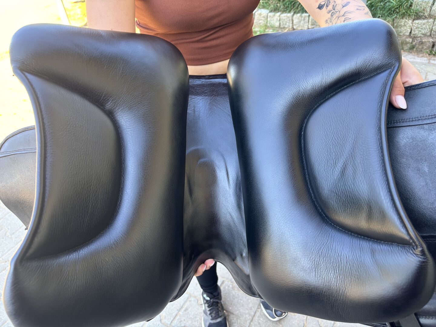 Very short saddle, therefore also suitable for short backs. Original chamber width 32.5 widened to approx. 34 (wide). The saddle has always been very adaptable, only being sold due to the purchase of a made-to-measure saddle from Uli Deuber.