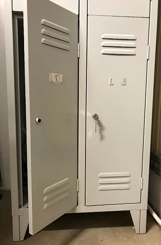 Ideal for the tack room: double-decker locker with feet / top condition - Double deck locker with feet / top condition! Two half height doors and compartments made of sheet steel on top of each other. Ventilation slots and device for nameplate on each door. Cylinder lock with key Dimensions: 61.5 cm (W) x 180 cm (H with feet) x 50 cm (D) Used in best condition: no rust, no scratches, no paint chips, no defect! Private sale, no guarantee, no return. Pick up in Linz Several pieces available