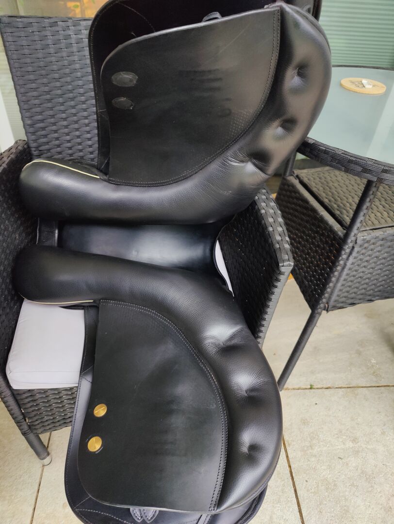 Kieffer Le Mans eventing saddle - For sale one year old Kieffer Le Mans eventing saddle in black with white contrast stitching. It was mounted on a wide huzul without withers and is also built for wide horses with rather straight backs. Seat size is 17.5 inches. New price was 2700€, saddle certificate is available. If required, I can also add a 125cm memory foam girth.