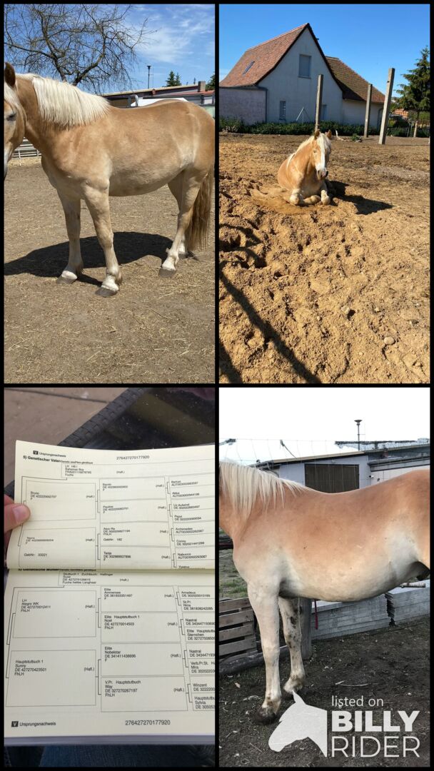 Large Haflinger gelding 3 years old - This handsome young man is looking for his new 5 star home. He is 3 years young and about 1.55 tall. He lives with us with 2 other geldings and a mare in an open stall, 24/7 hay. According to age you can lead him and he is anlongiert. Other than that, we haven't done much yet. He should be allowed to be a child. He knows dogs and poultry that run around between the horses. He is also familiar with tractors. He is curious and open-minded. At the vet he is very exemplary and lets himself be vaccinated and examined without flinching. He also accepts the worming without any fuss. He is cuddly and always runs after us when we clean the paddock. He has a very interesting pedigree, see the attachment in the pictures. He only moves out when everything fits. He is not a! distress sale. If you are interested please contact me.