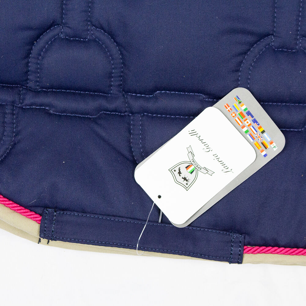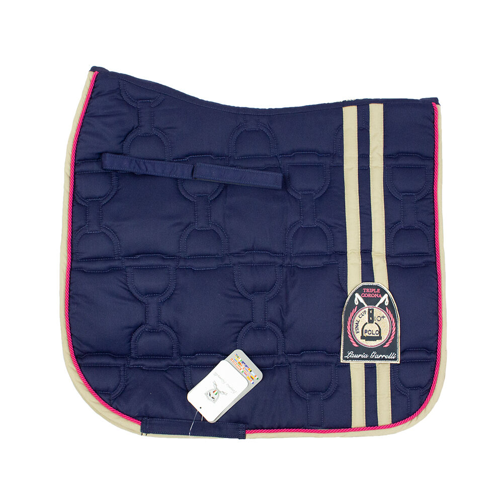 Lauria Garelli Saddle Pad Deep Blue DR - A beautiful and high quality dressage saddle pad from the company Lauria Garelli by HKM. The great saddle pad in Deep Blue with beige border and pink decorative cord is a real eye-catcher under the saddle. It has a great bit quilting and a beautiful dark blue color. Currently we have the matching bandages and fly hood in the store. She is new with label.