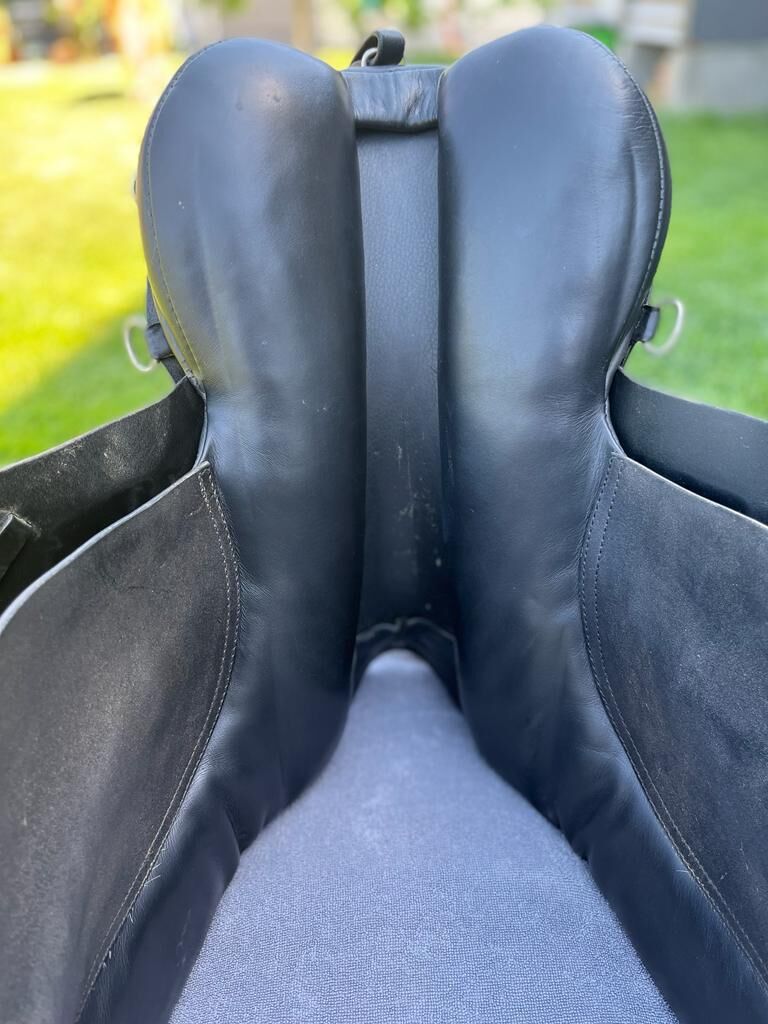 - Used from leisure riding (NP € 1,890), in very good condition with the typical signs of use, soft leather, incl. crupper and 1 pair of special Tölt stainless steel stirrups with curved shanks and 90° turned stirrup strap eyelet, black rubber inlay, 12.5 cm tread width - Smooth seat with raised panels for a shortened contact surface - Long girth straps - Attached knee rolls for good support - Support surface 45-48 cm, raised panels (see pictures, therefore suitable for short backs), with a seat surface of 17.5" - Wedge cushion, good shoulder freedom - Color: black and full leather - Chamber approx. 20 cm (see pictures) - Saddle has always been well cared for, greased and stored dry, 1st hand
