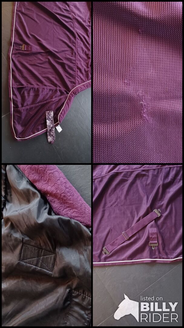 Mesh blanket with fleece back 155cm - Beautiful mesh blanket from Felix Bühler. The back part is made of fleece with beautiful ornaments. A removable belly strap optimizes the blanket for stable and transport. Dark berry. In the mesh part slight abnormalities from the Velcro (happened during washing).