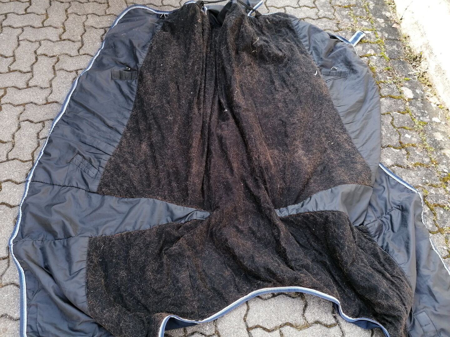 Rain blanket with fleece insert 50g - Well preserved used rain rug with flow insert 50g Size 165 Was used 2 season as a transitional blanket at my late mare. Therefore also still some hair inside, which mann can remove certainly in the cleaning. 2 small holes inside the fleece