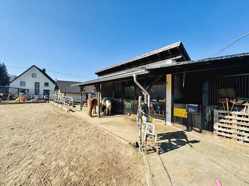 Ref2542MK Rhineland-Palatinate, Westerwald, Bellingen - House with horse keeping - Rhineland-Palatinate, Westerwald, Bellingen Residential house with horse stables and riding arena 🔸 ~ 6,460 m2 plot of land + 3,500 m2 of leased land 🔸 ~ 185 sqm living space (7 rooms, including 4 bedrooms), 2 bathrooms 🔸Horse stable with 3 horse boxes, riding arena with drainage, saddle and feed room 🔸Own well, power connection, 2 garages
