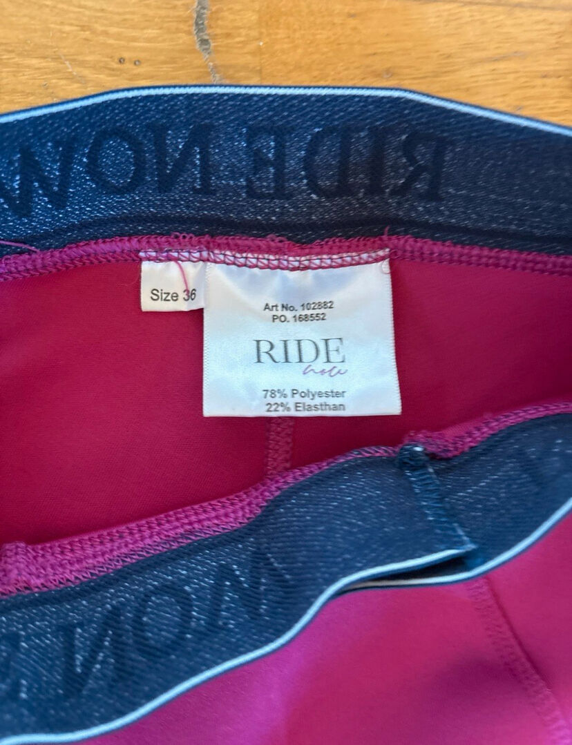 Ride Now Breeches Pink - Hello, I am buying a pair of Ride Now breeches in the color pink and in size 36. They have a hand pocket and knee patches. The breeches have only been worn once