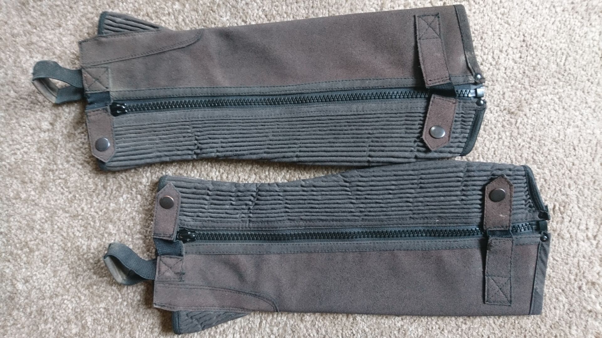 Riding chaps - Gaiters, L - Unfortunately we have to give up our hobby with heavy hearts and for health reasons. Therefore we give away a few chaps - gaiters in size L. Elastic and super comfortable chap made of rubber. The anatomical fit provides a comfortable fit on the leg by elastic insert. Zippers, Velcro and snaps are flawless. There are no holes, stains or other damage. Unfortunately, they have become brown with time, previously they were black. Since they are still flawless in function and are too good to throw away, we give them away.