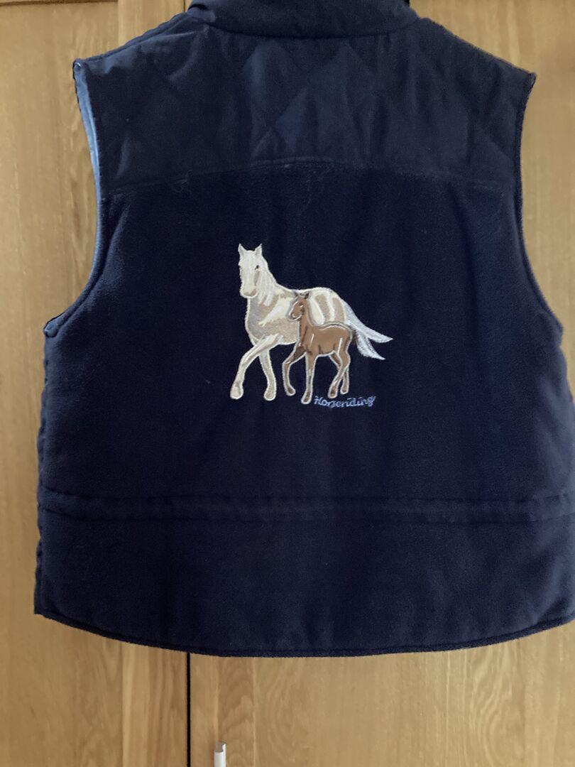 Riding quilted vest from TCM Gr 122-128 - Blue quilted vest with light blue lining and fleece back with horse applique. Front zipper with snap button placket above.Two side zipper pockets. An internal drawstring for fine adjustment.