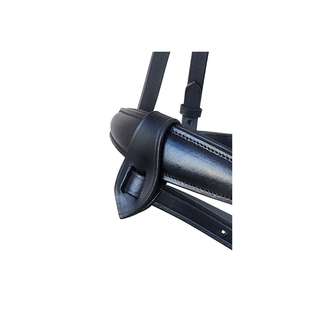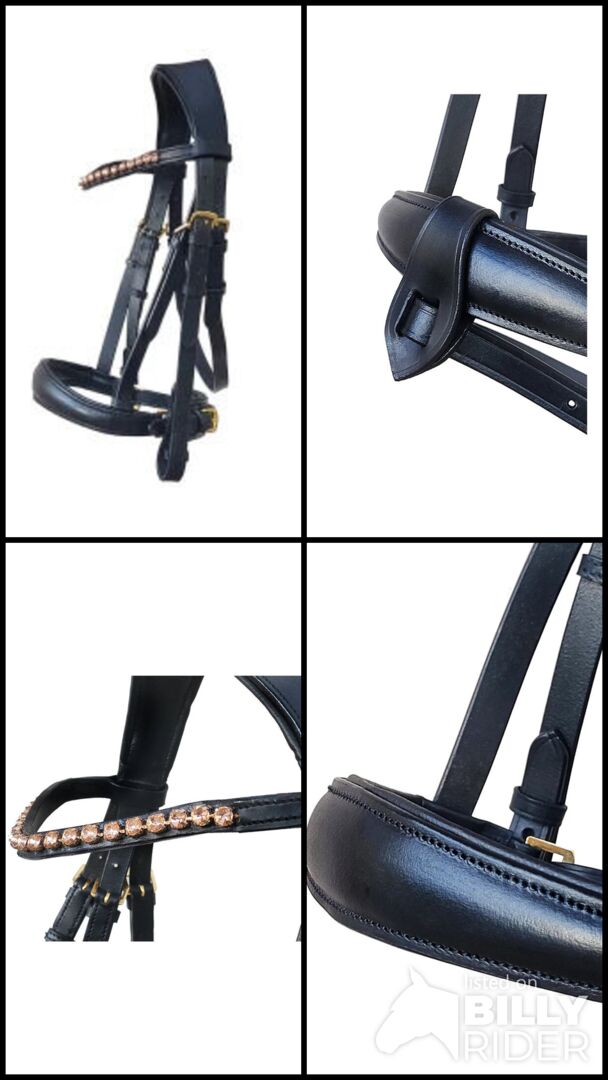 Snaffle bridle "Brianna" detachable locking strap size Cop - "Brianna" snaffle bridle with detachable locking strap made of leather with detachable locking strap glittering rhinestone browband in subtle to bold rose gold tones slightly curved browband brass-colored fittings Swedish noseband anatomically shaped headpiece lined on nose and poll incl. web reins