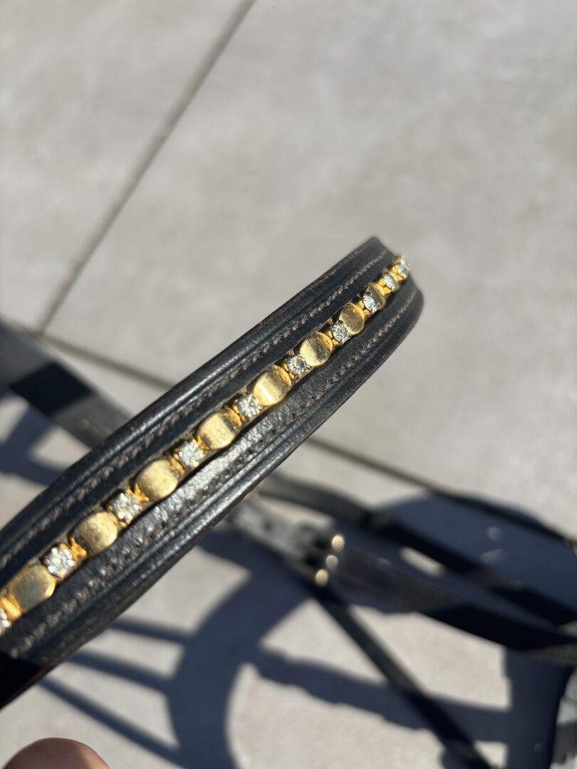 Snaffle with golden details - I am selling my bridle which has hardly been used. Including browband , bit and reins . The bridle is new the bit was used with pleasure ! Size is Cob/Full . The price is of course negotiable. Shipping possible for a fee.