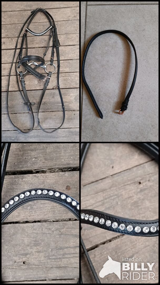 Snaffle without bit, with browband and reins - Snaffle Leather Black Browband with rhinestones Double broken water snaffle Cob Locking strap available Will be cleaned before shipping