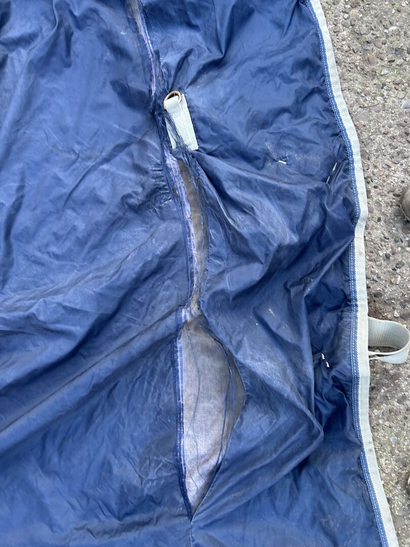 Stable cover not rainproof - I sell this stable blanket I bought it myself about a month ago for my horse, because it is in the open stable I no longer need it. I thought it was rainproof but it was not. It is also torn at the sides and has no tail and no leg straps, in addition a hook of a belly strap is bent and rusts the blanket is still being cleaned but is well closed Size: 145cm.