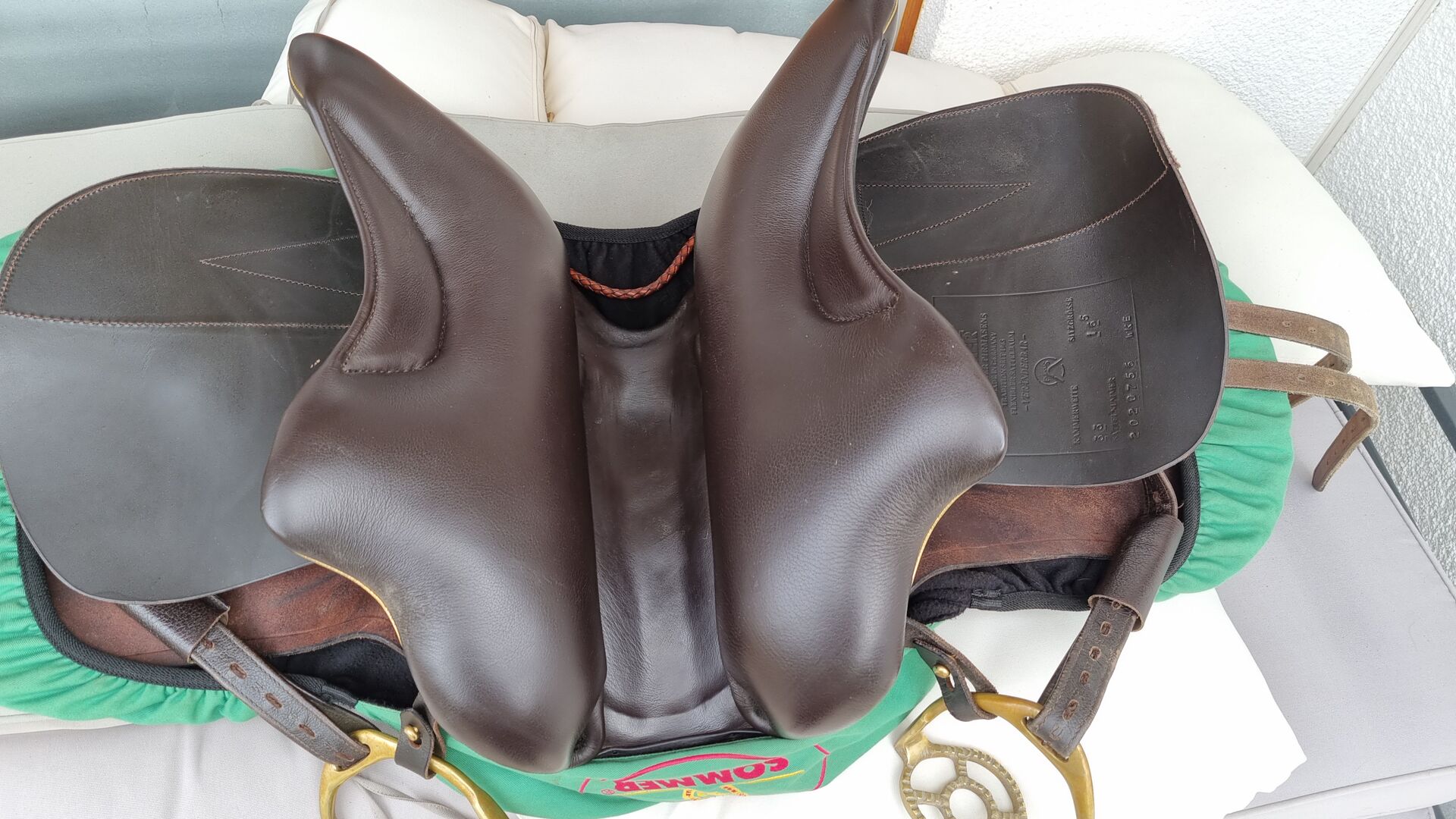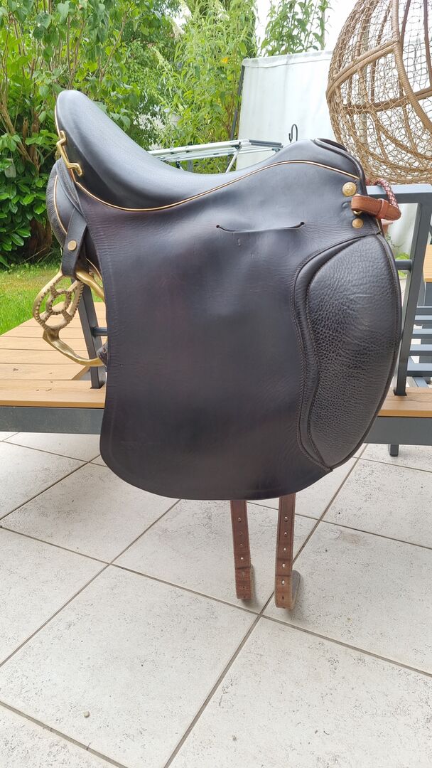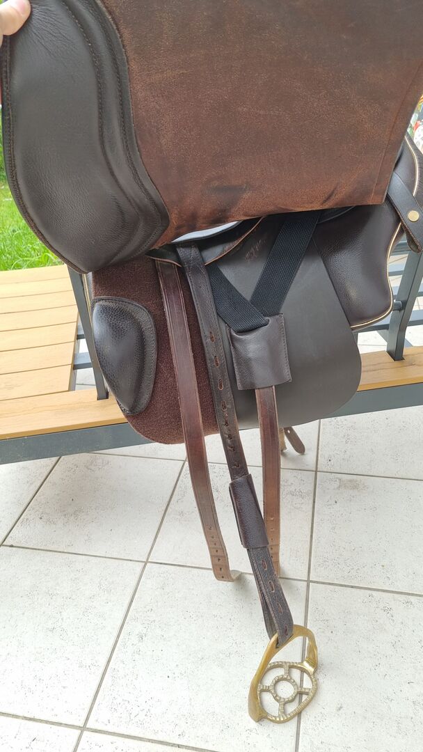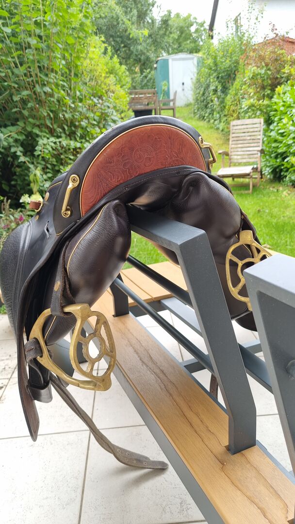 - made of mainly brown Juchten leather - with slit in the leaf - Color mocca - stitching mocca - fittings gold - half moon montana cognac - piping gold - with matching stirrup hanger (brown/gold)
