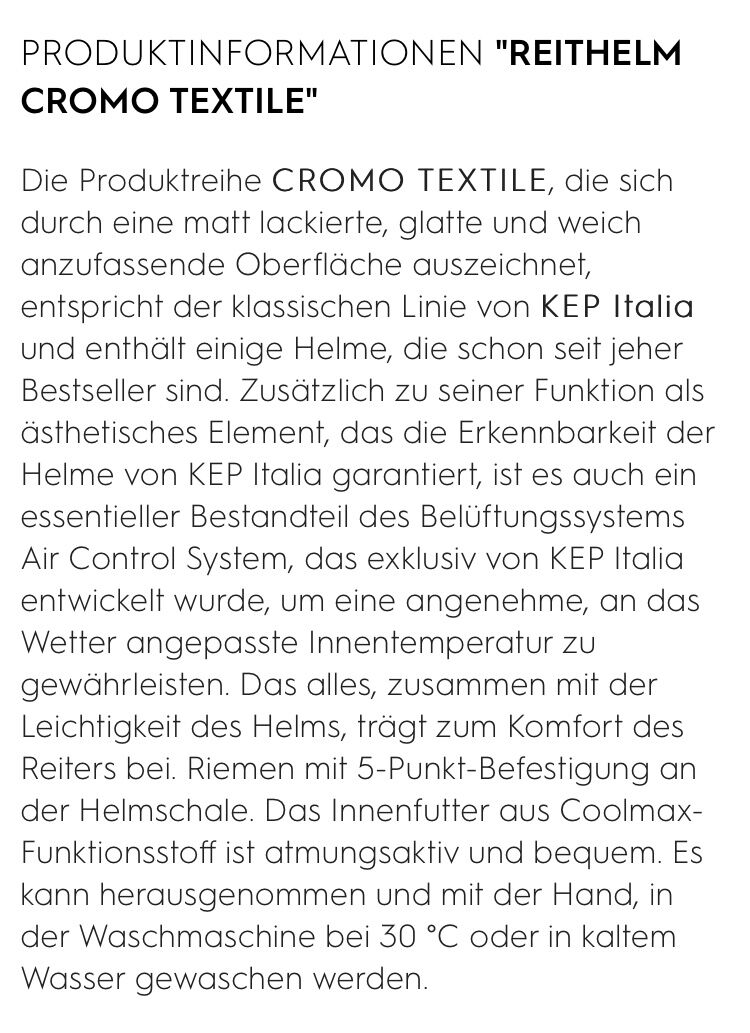 Unworn, new KEP helmet NP 598.50 - Description in the photos. Sell my brand new KEP Cromo Textile. A new inlay in size 55-56 could be purchased directly with. The matching inlays must always be purchased separately from KEP. New price helmet including inlay was 598.50Euro . Gladly makes me a realistic offer.