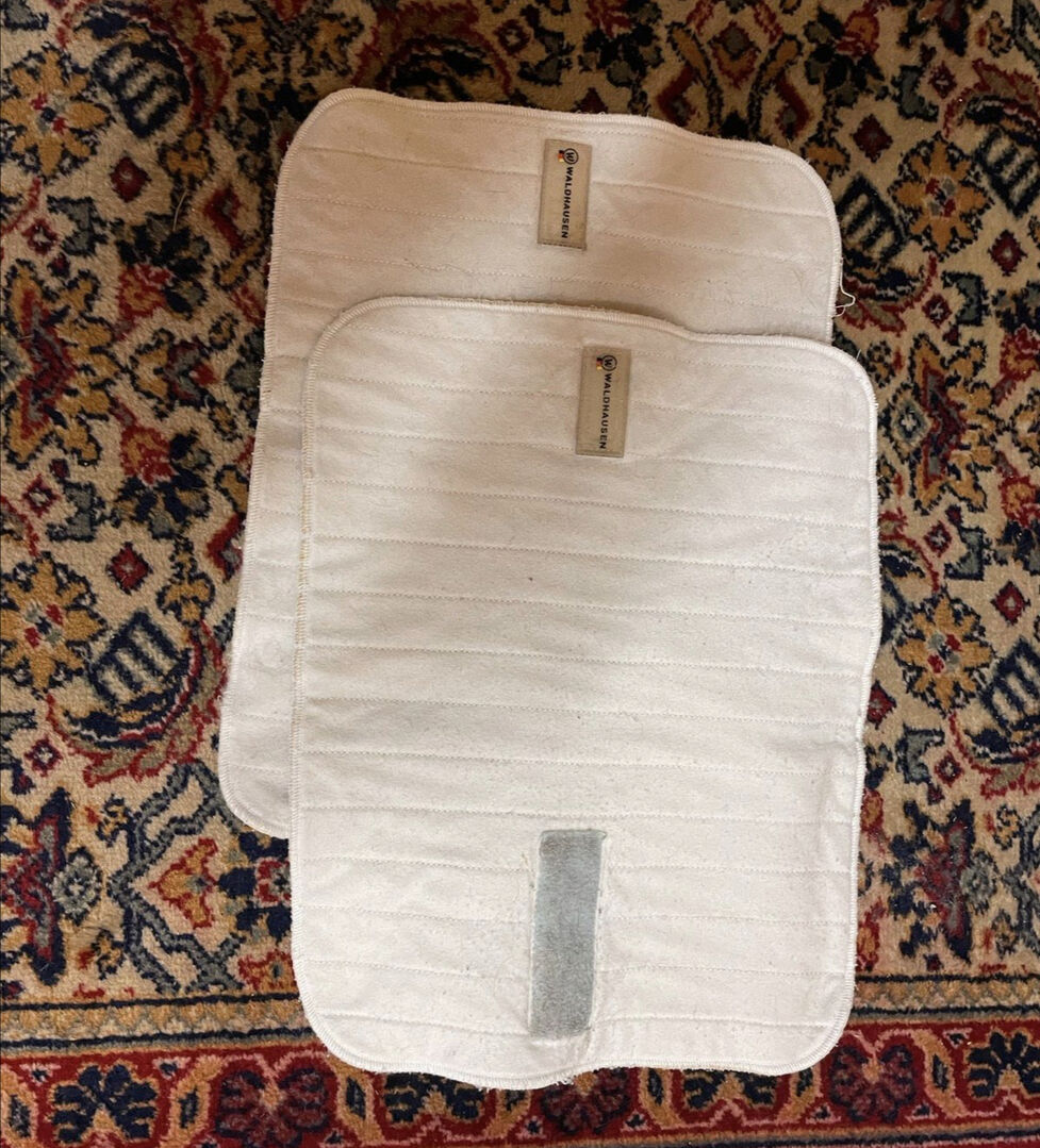 - Eskadron Climatex bandage pads (set of 2) in black, have been used but without holes or similar, original price: 30€ (selling price: 15€) - Waldhausen bandage pads with Velcro fastener (set of 4) in white, have been used but are in good condition, original price was 25€ (retail price: 15€) - Eskadron Climatex bandage pads (set of 2) in blue, have been little used and are therefore in very good condition, original price was 30€ (retail price: 15€) - TransHorseSport bandage pads with reinforcement in the hoof area in gray (set of 2), they were little used and are in good condition, original price was 50€ (retail price: 20€)