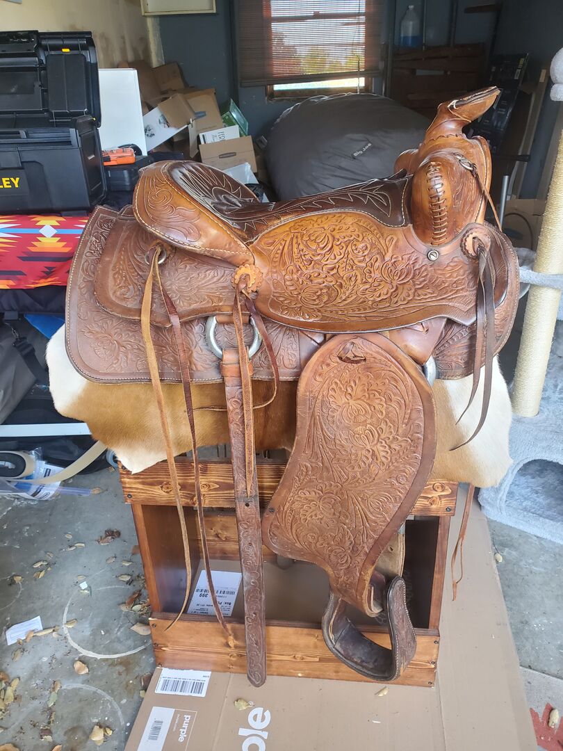1950s roping saddle. Used condition, quick change buckles, and good quality sheepskin.