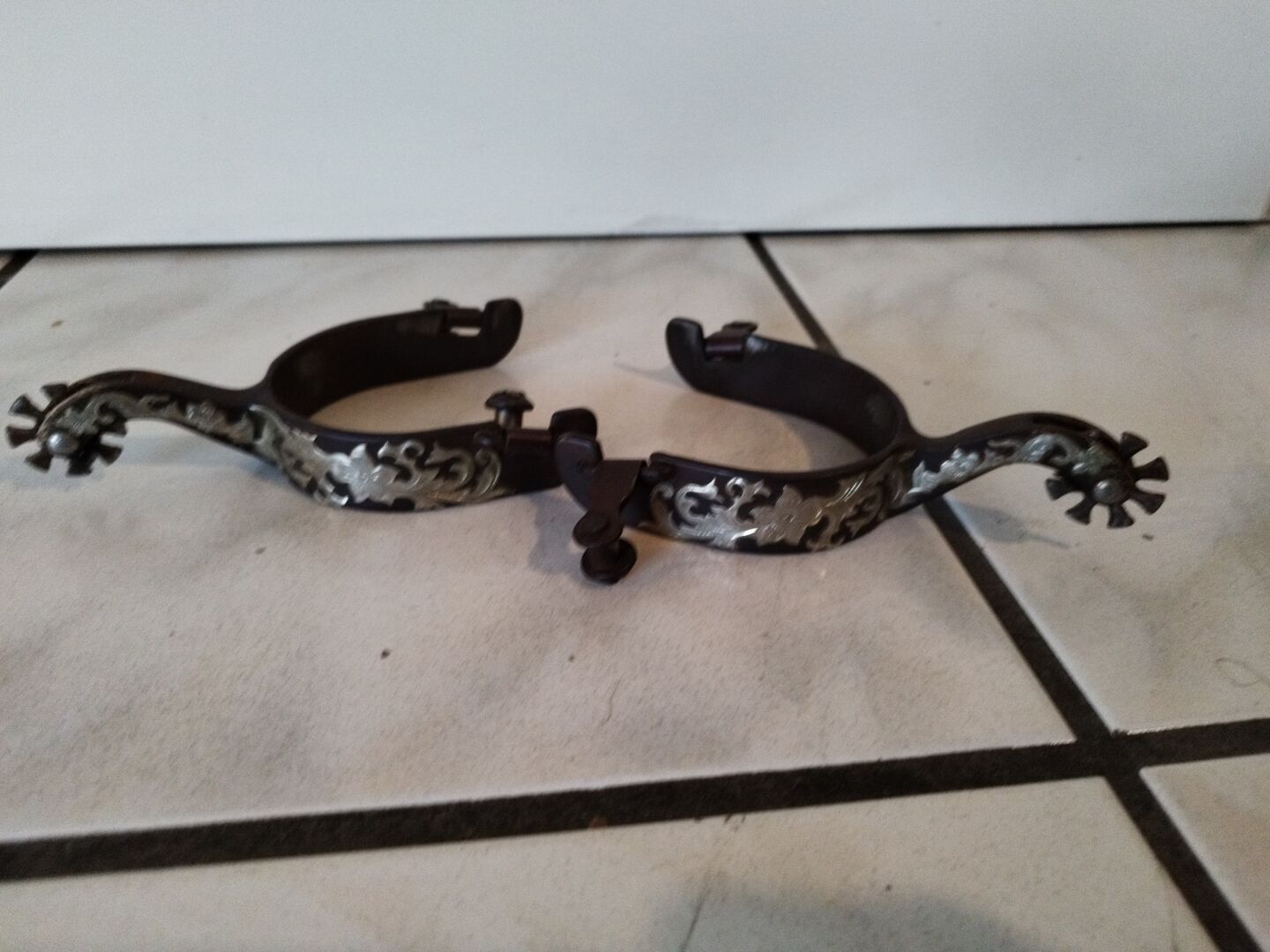 Western spurs antique style - We are selling these little used western spurs. Cool Flowers in Antique Style Solid Brown steel finish Curved wheel neck 8 Point Rowel