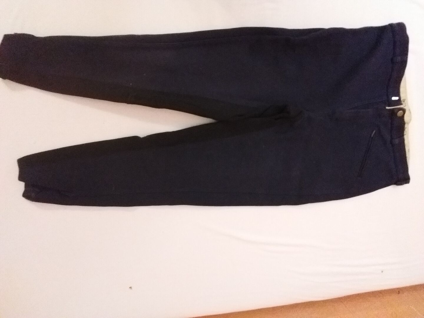 Zaldi breeches - A pair of breeches in dark blue with black heels on the inside thigh and bottom area, key pocket on the left and zipper pocket on the right front are available size 42 the width is adjustable at the feet with Velcro little worn, good quality, slight fading due to lying down